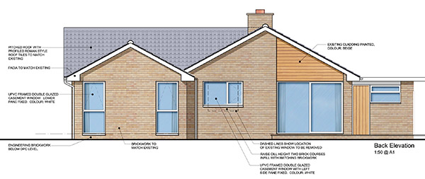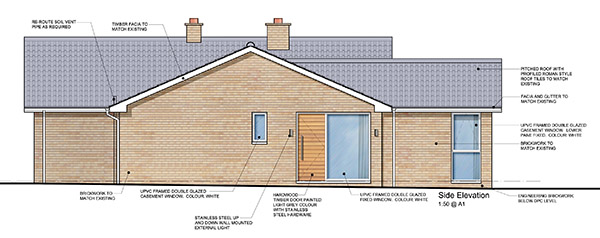 As part of our brief, the client felt it was important that the new extension was complimentary to the original house whilst still being contemporary. Since bungalows of this age where considered modern when they were built, contemporary features are not out of place with the original style. One simple but significant proposed change is to replace the existing darkly stained timber with light coloured cedar cladding and then carry this through to feature on areas of the new elevations. This simple change of materials creates a much more contemporary and updated look.